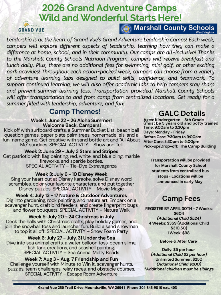 Please email Ben at bbolock@grandvuepark.com with any questions regarding Grand Adventure Leadership Camps.